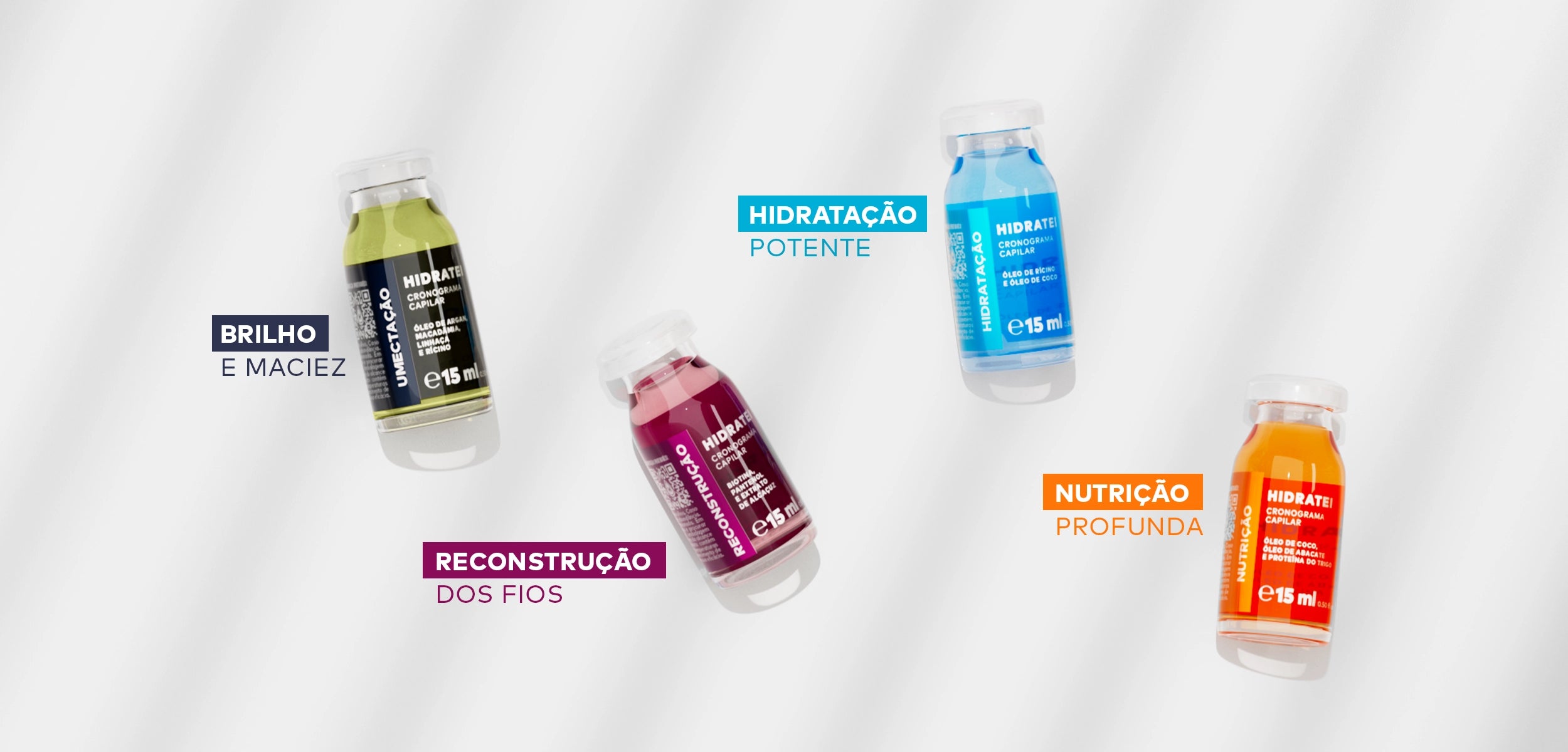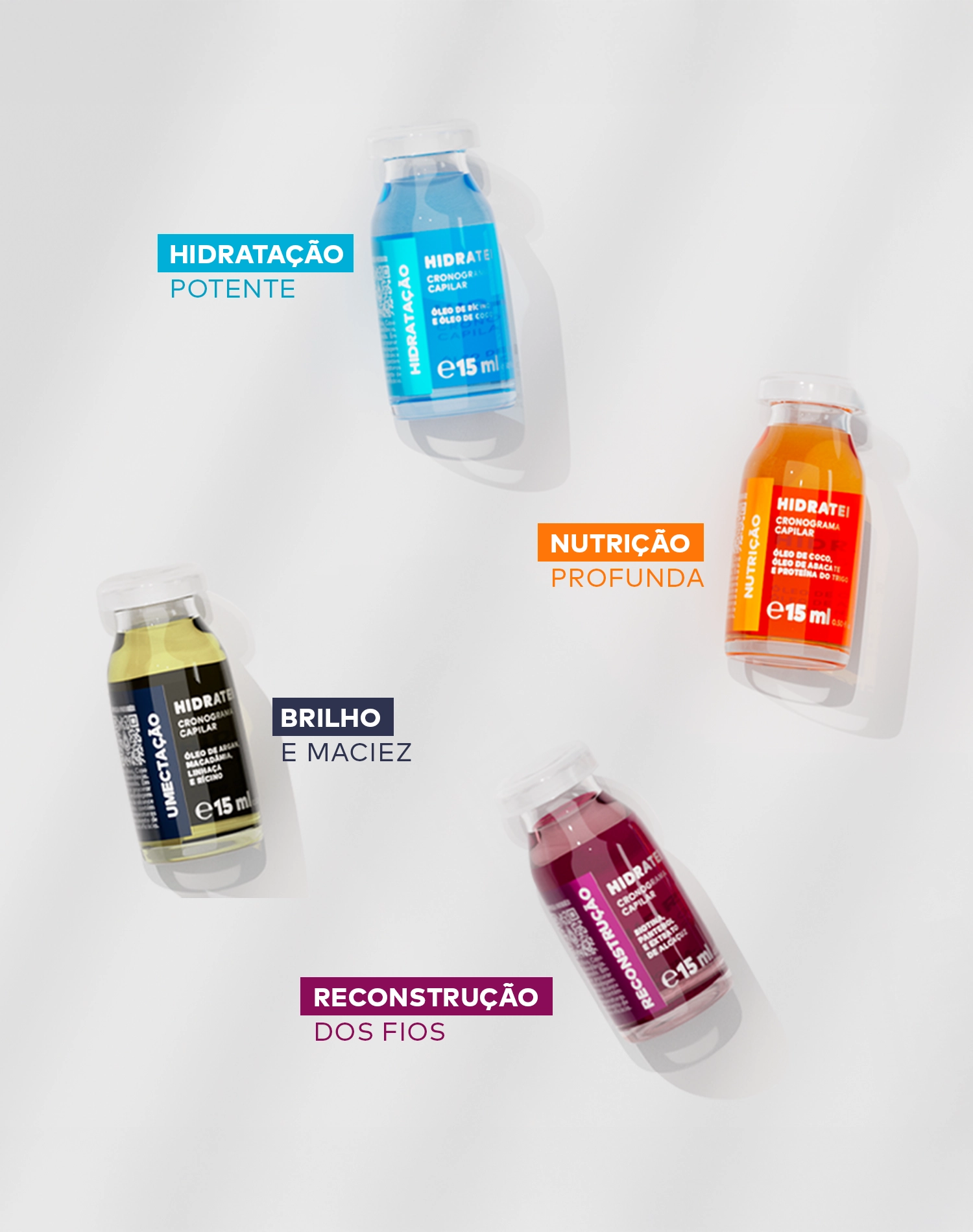 Após a lavagem com o Shampoo e com os cabelos úmidos, aplique as ampolas de Hidratação, Nutrição ou Reconstrução no comprimento e pontas dos fios. As ampolas são autoemulsionantes e podem ser misturadas com as Máscaras de Tratamento Hidratei ou aplicadas diretamente nos cabelos. Massageie suavemente, deixe agir por 3 minutos e enxágue bem.